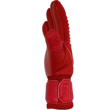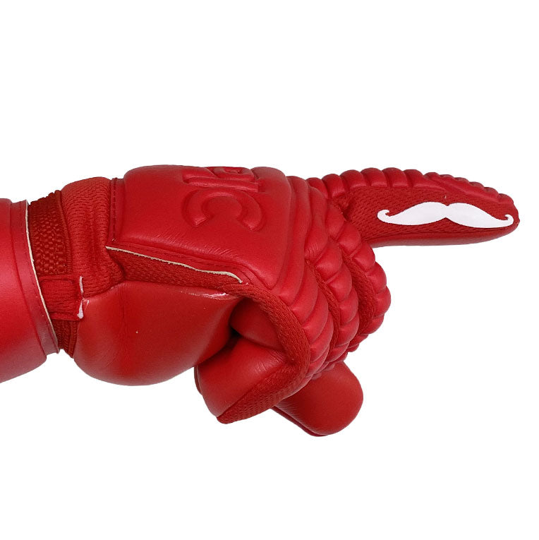 Our Red Glue glove features a classic, all-red look with a negative cut, for a snug, slim fit to your hand. The palm is a sticky 4mm German contact latex. The backhand has a body-guard mesh that is laminated and cushioned. Over the mesh are 8mm latex padded backhand, fingers, and thumb. The cuff and latex strap are red. Each pair features a large mustache inside both index fingers. Have fun making saves and “mustaching” people!